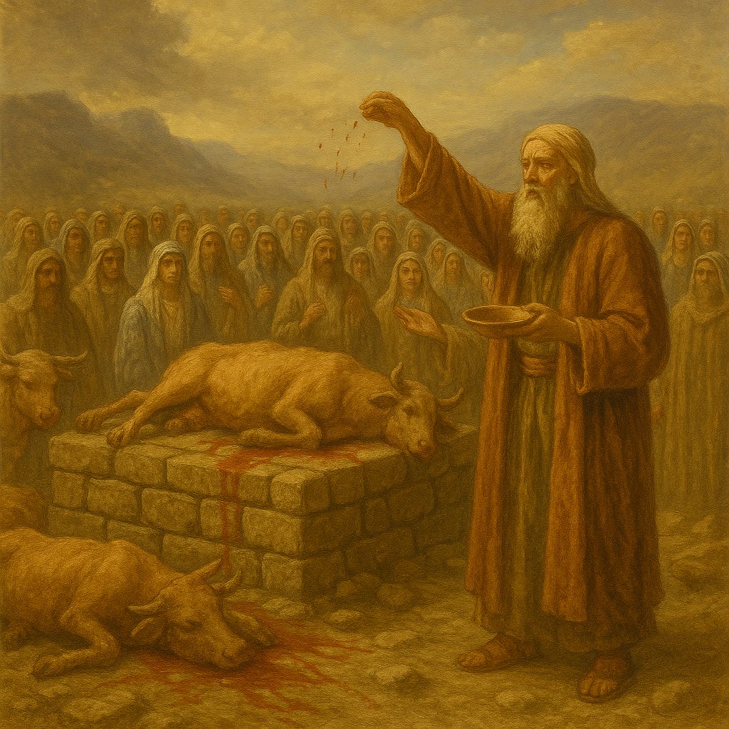 As described in Exodus 24, it included spoken and written conditions, solemn oaths, witnesses, a ratified agreement, symbolic acts, and a celebratory meal. God said, “You will be my people,” and Israel responded three times, “All that the Lord has spoken we will do.” It was at once legal and relational — a holy betrothal of God to a people He had called His “treasured possession” (Exodus 19:5–6). But unlike any wedding we’ve attended, this covenant ceremony was sealed with the sacrifice of oxen and the sprinkling of blood on the altar and on the people.